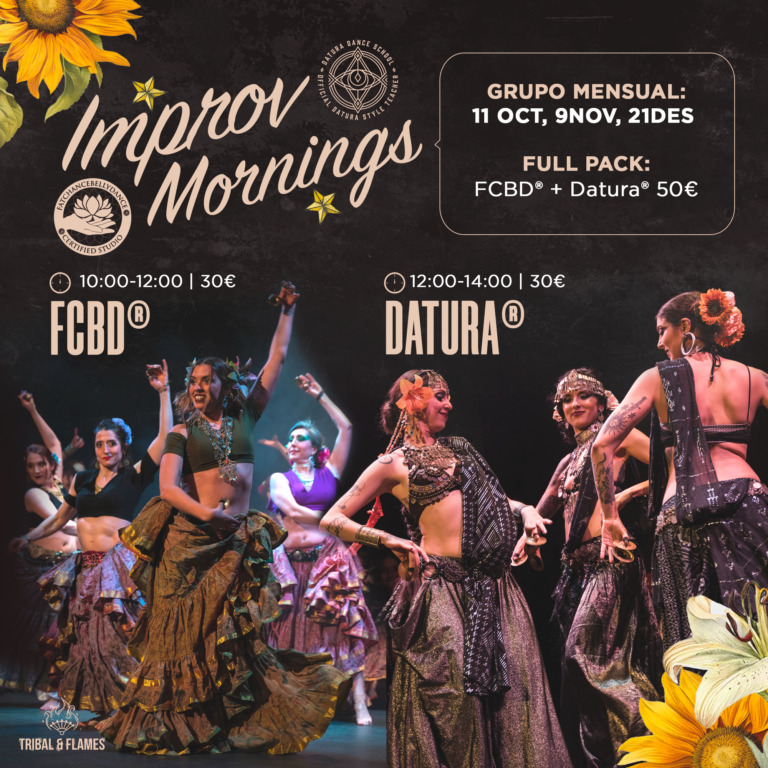 Ideal si no puedes venir entre semana y te va mejor un sábado (o domingo, depende del mes) mensual. Está enfocado a los sistemas de improvisación en tribu, por un lado FCBD® Style (más folklórico) y por el otro Datura® Style (estilo de Rachel Brice). En ámbos se baila y se tocan los crótalos/Zills.