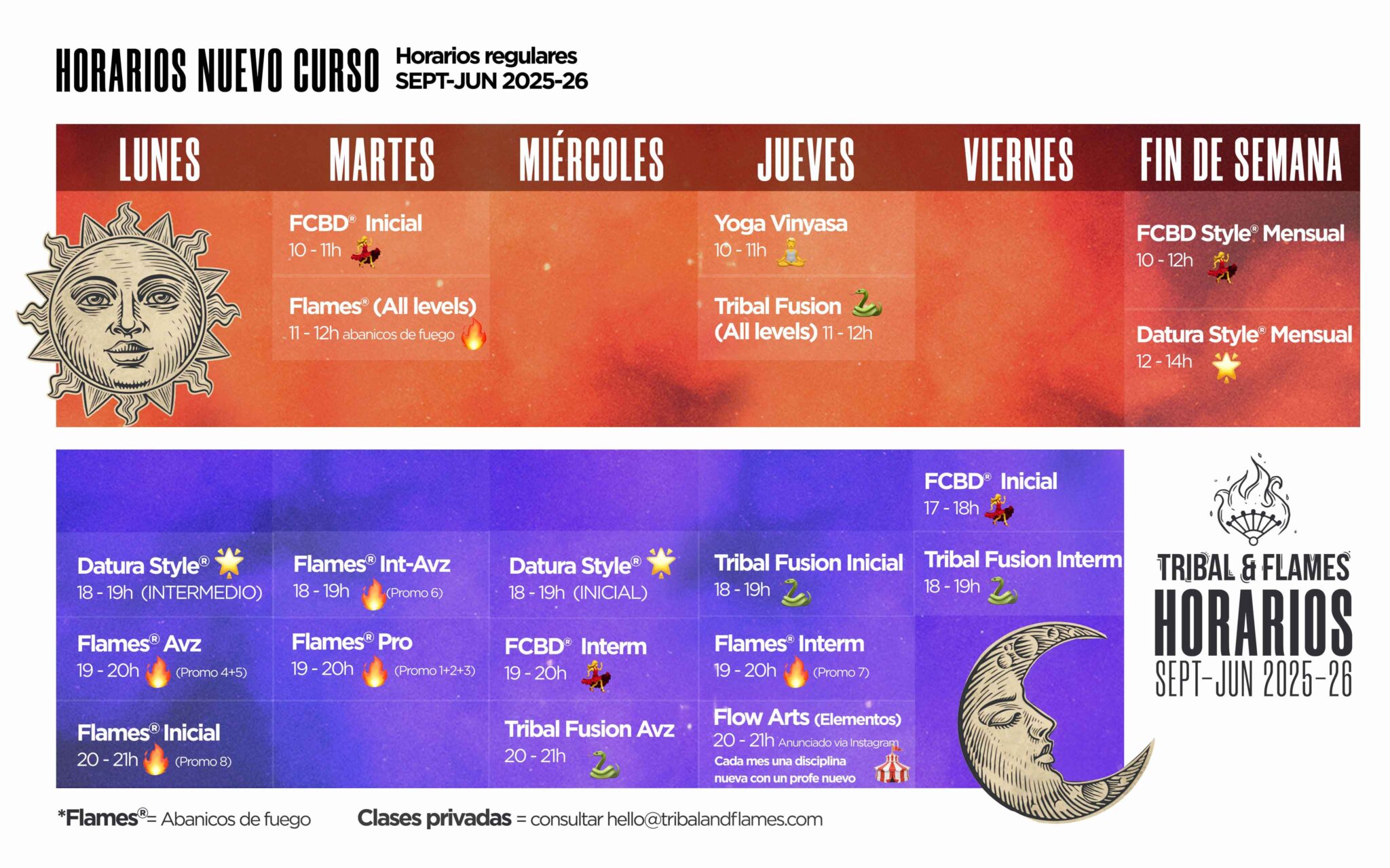 Escoge tu disciplina o tu pack y comunícanoslo en hello@tribalandflames.com. Si tienes alguna propuesta de horario nuevo, escríbenos 🙂 ¡Nos vemos en clase!